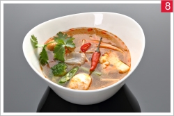 Säuerlich scharfe Suppe mit Garnelen, Champignons, Sellerie, Gemüse